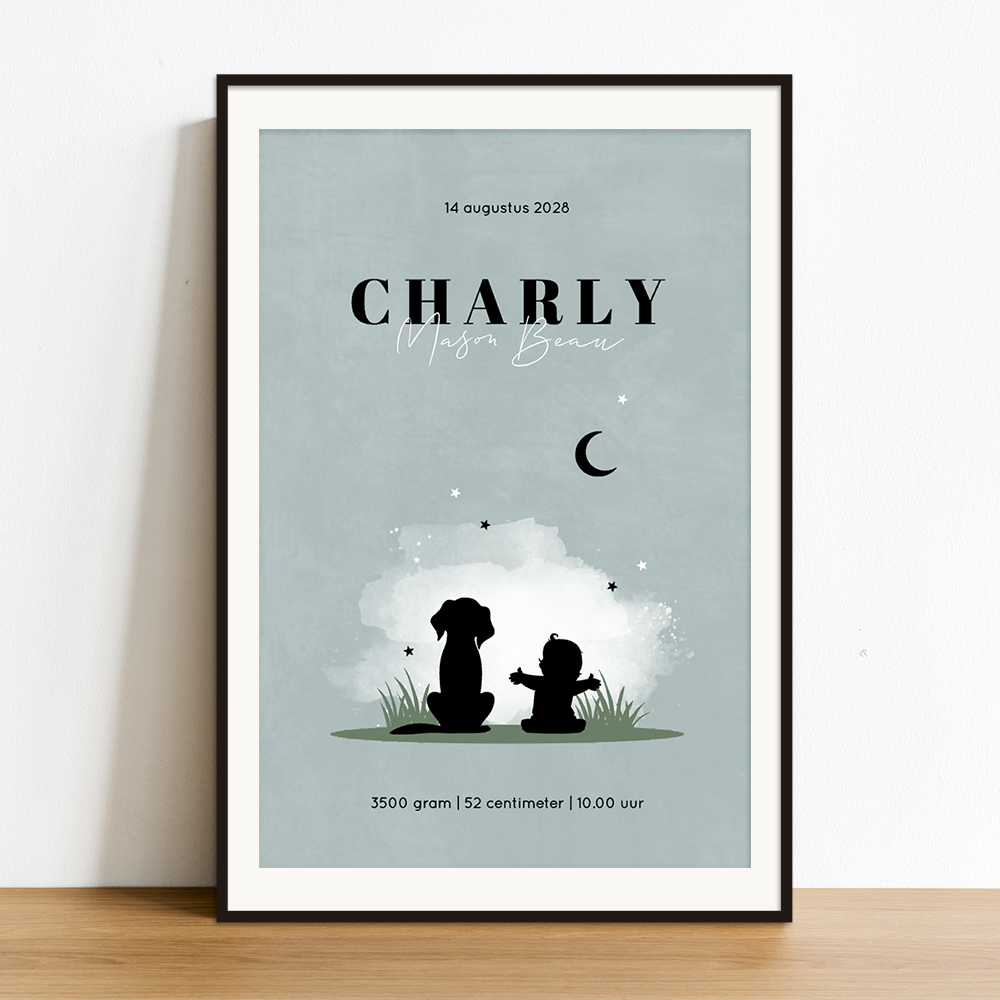 Op zoek naar een mooie geboorteposter voor de kamer van je zoontje? Ga voor dit lieve ontwerp met silhouet kindje en hondje. Onderaan de poster is ruimte voor alle geboortegegevens van je zoontje. Pas eventueel verder de kleuren of lettertypes aan in onze handige editor.