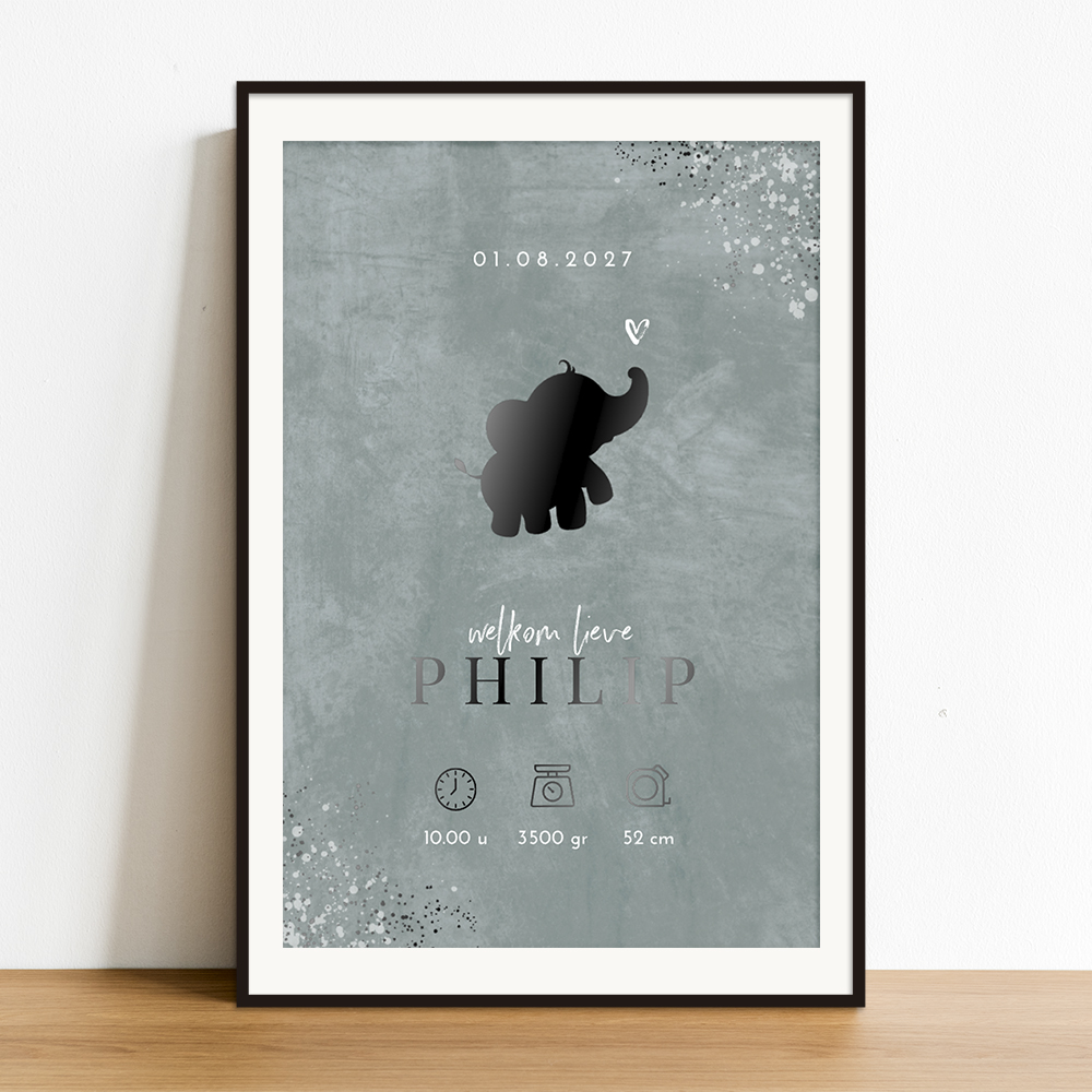 Een grijsblauwe geboorteposter met een hoogglans olifantje. De naam, geboortedatum en geboortegegevens krijgen een plekje op deze leuke poster. Versier de babykamer van je zoontje of geef deze poster als kraamcadeau. Deze poster sluit perfect aan bij dit geboortekaartje. De kleur van alle elementen kun je eenvoudig aanpassen met onze editor, zo ook de achtergrondkleur.