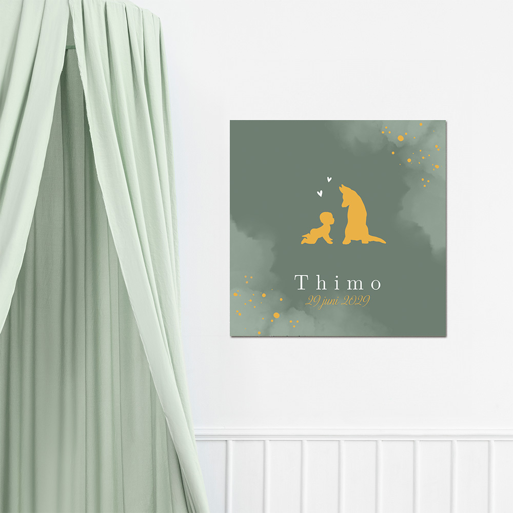 Leuke groene poster met okergele baby met hond in silhouetjes. Wil je met foliedruk? neem dan contact op met onze klantenservice dan zetten we de poster voor je om naar een luxe variant met goudfolie.