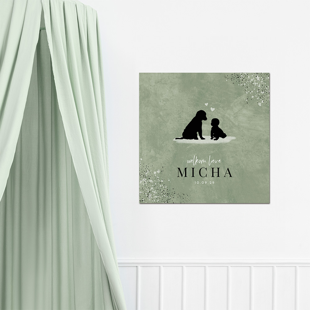 Groene, vierkante poster voor op de babykamer met silhouetjes van een hond en een baby. De poster wordt verder versierd met spetters en waterverf vlekken.