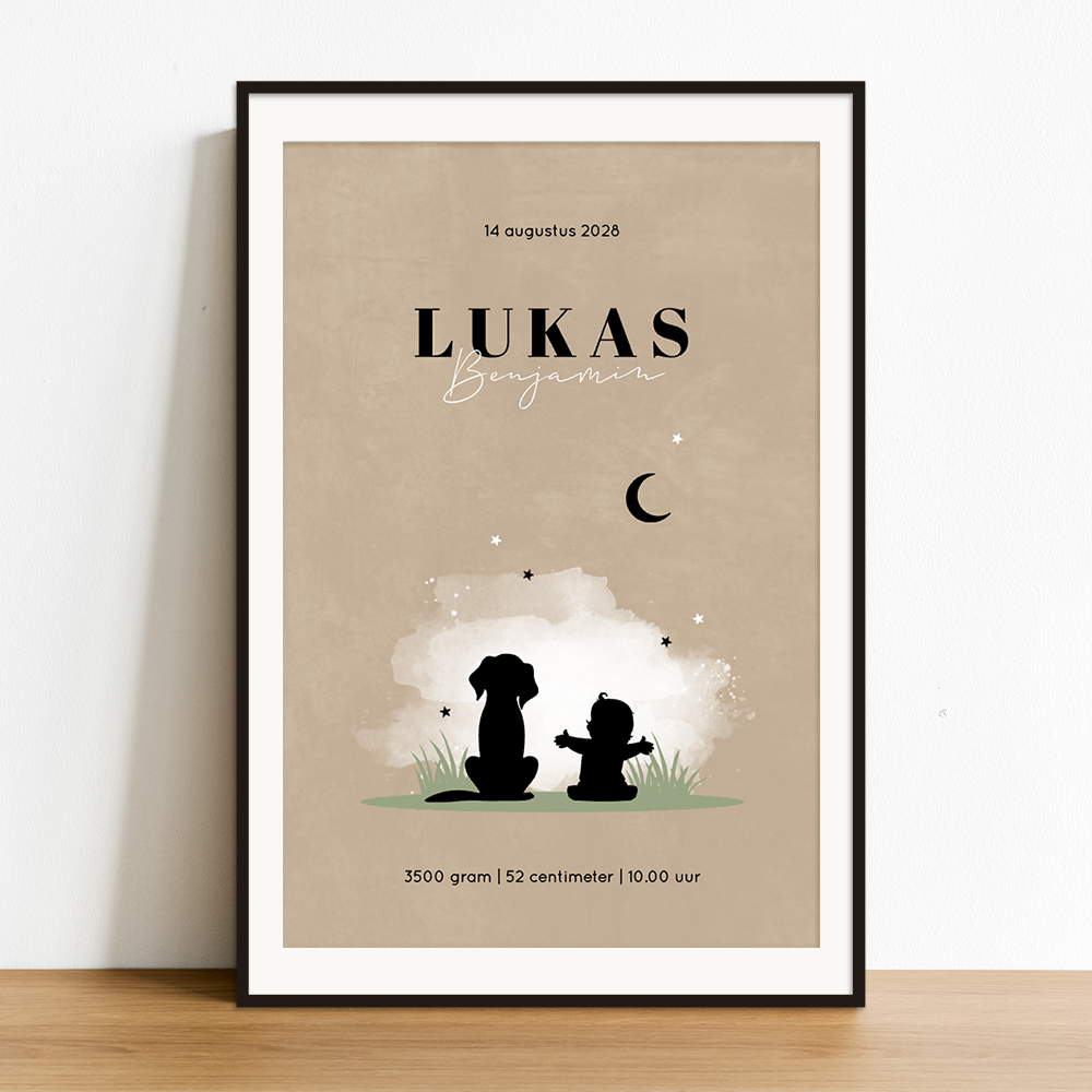 Zandbruine geboorteposter met silhouet jongen en hondje