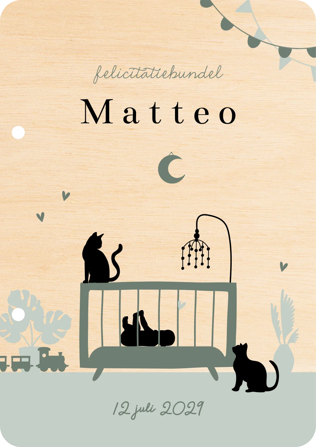 Bewaarbundel met silhouet baby in wiegje met twee katten die nieuwsgierig toekijken. Deze bewaarbundel is gemaakt van multiplex hout, heeft afgeronde hoeken en twee metalen ringen. Je kunt de voorzijde van de bundel naar wens personaliseren in de editor.