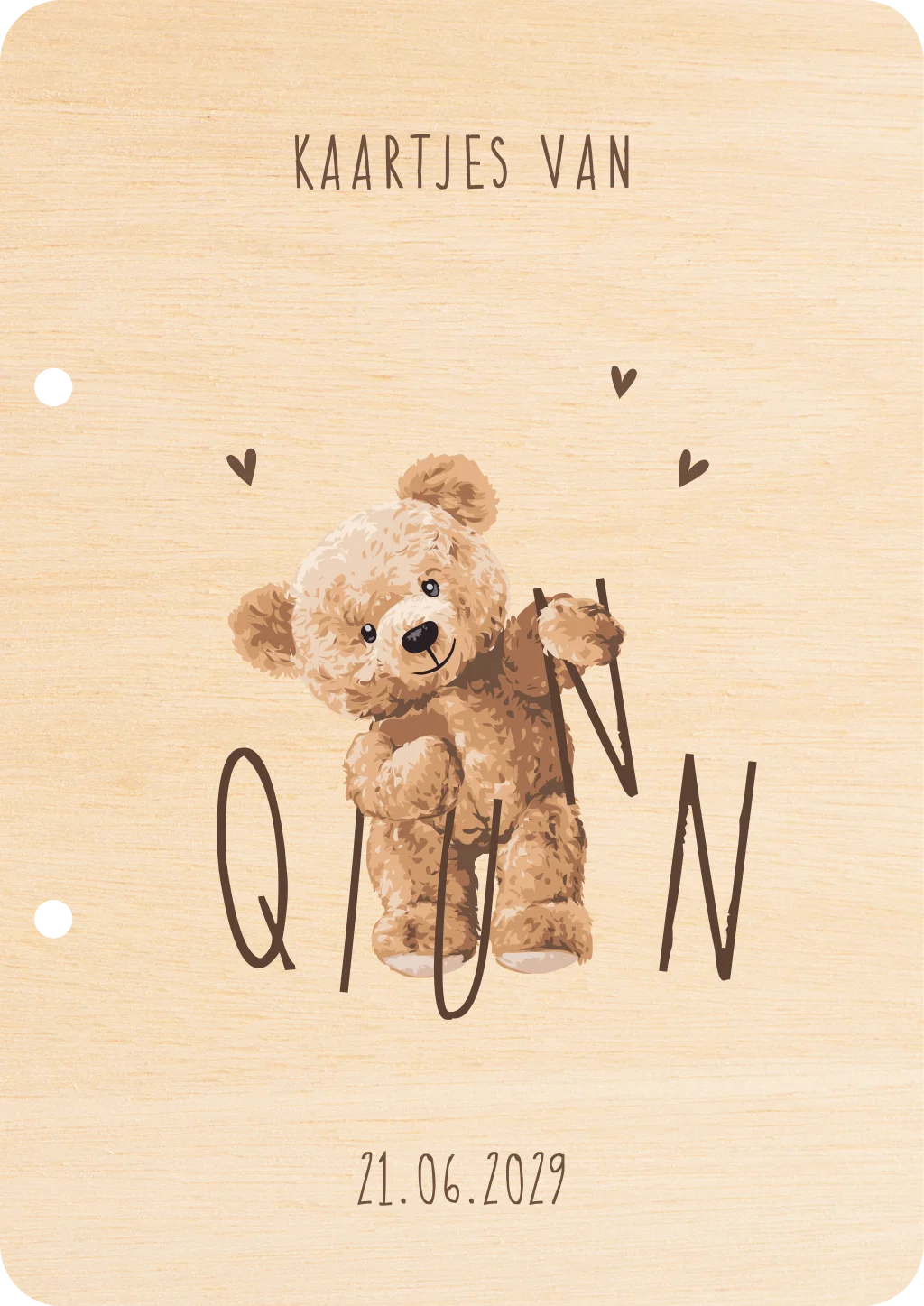 Bewaarbundel met een bruine teddybeer die de naam van je kindje vasthoudt. Deze bewaarbundel is gemaakt van multiplex hout, heeft afgeronde hoeken en twee metalen ringen. Je kunt de voorzijde van de bundel naar wens personaliseren in de editor.