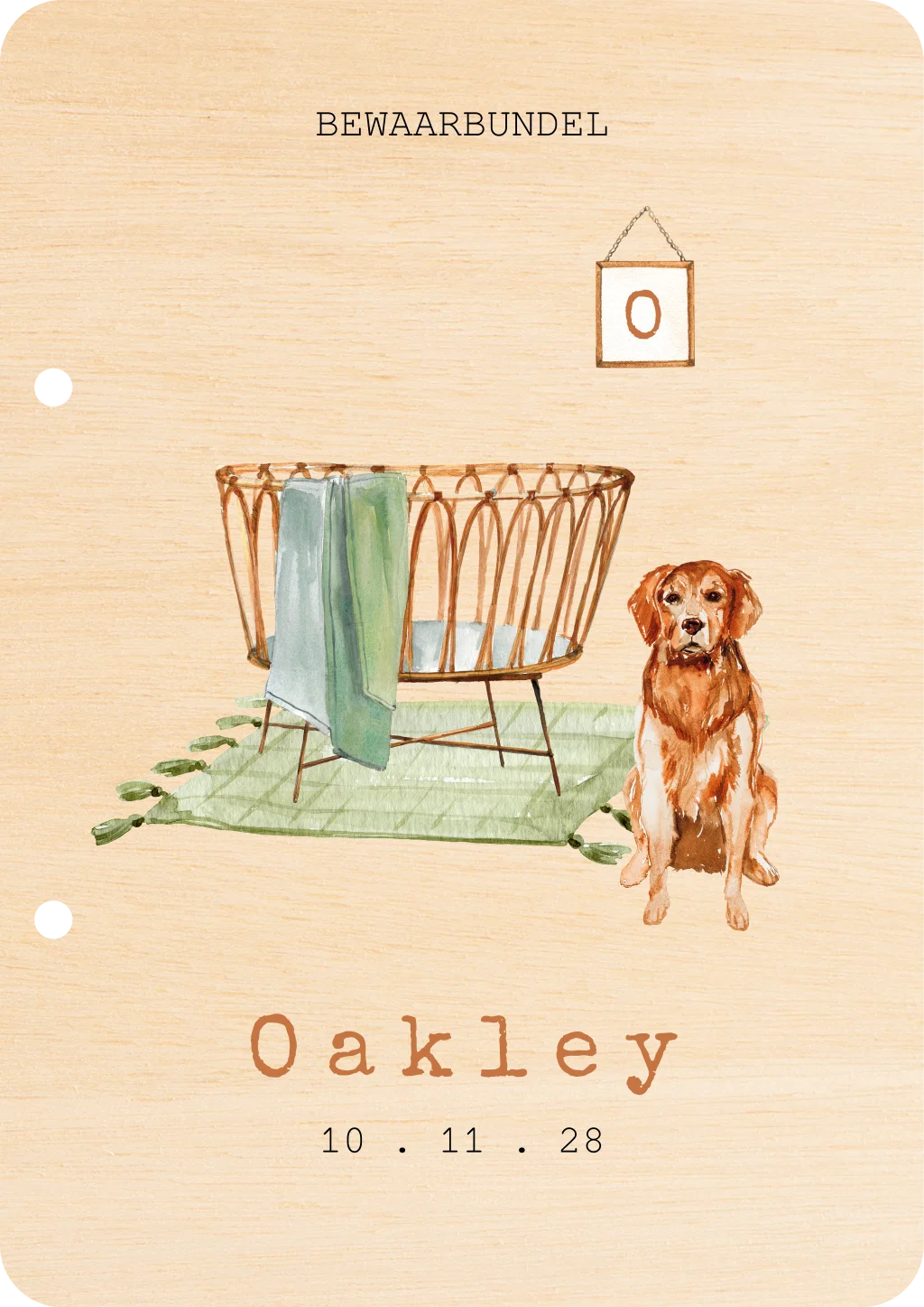 Bewaarbundel met houten omslag en aquarel tekening wiegje met hond. Deze bewaarbundel is gemaakt van multiplex hout, heeft afgeronde hoeken en twee metalen ringen. Je kunt de voorzijde van de bundel naar wens personaliseren in de editor.