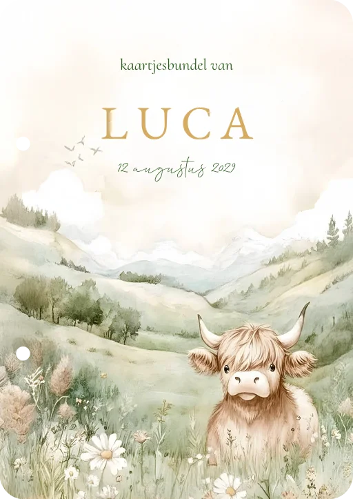 Leuke houten kaartjesbundel met Schotse hooglander voorop. Deze bewaarbundel is gemaakt van multiplex hout, heeft afgeronde hoeken en twee metalen ringen. Je kunt de voorzijde van de bundel naar wens personaliseren in de editor.