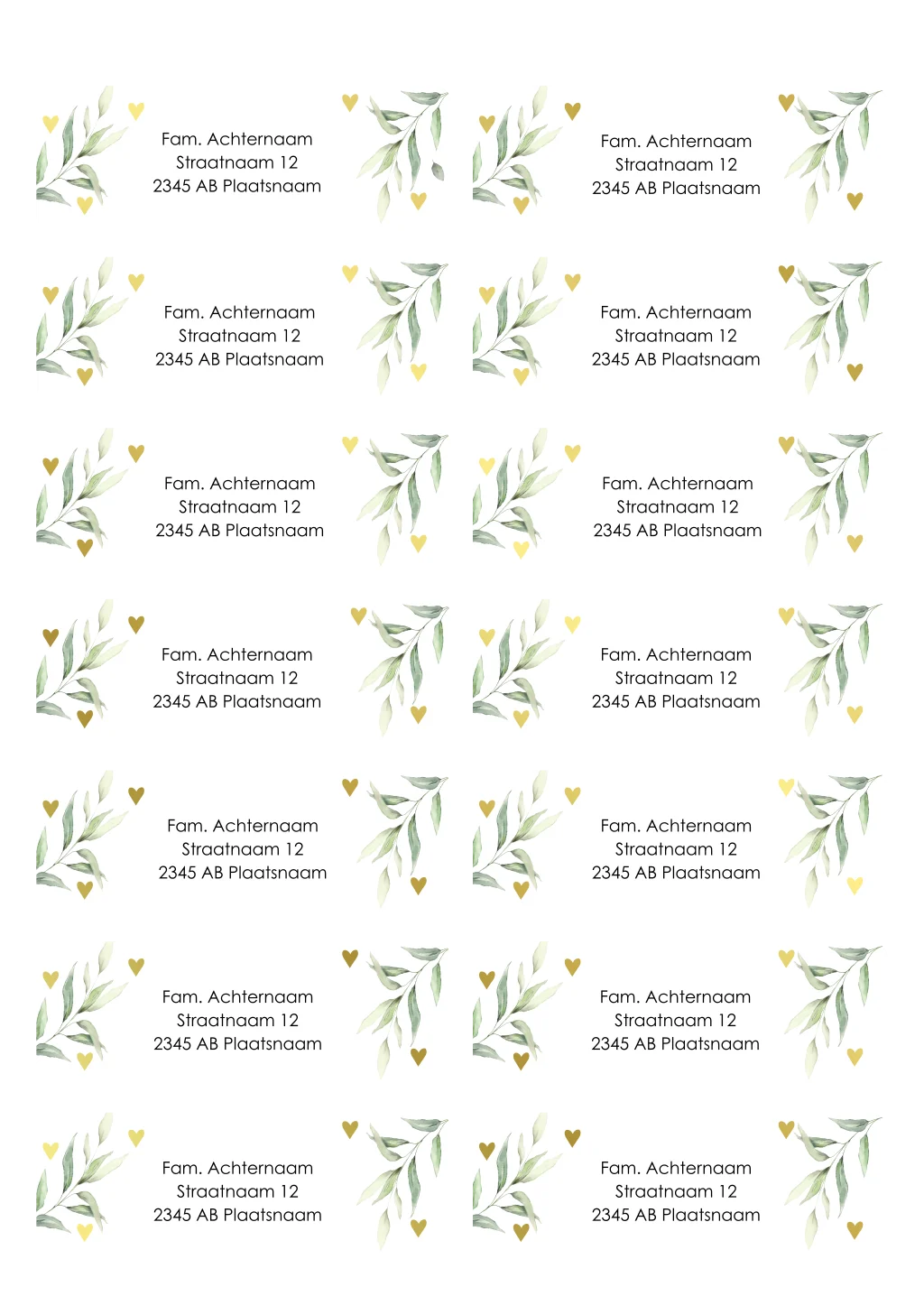 Deze adresstickers passen bij meerdere geboortekaartjes met blaadjes en goudfolie hartjes. Je kunt het ontwerp moeiteloos aanpassen met de editor en zelf heel eenvoudig alle adressen op de adresstickers plaatsen.