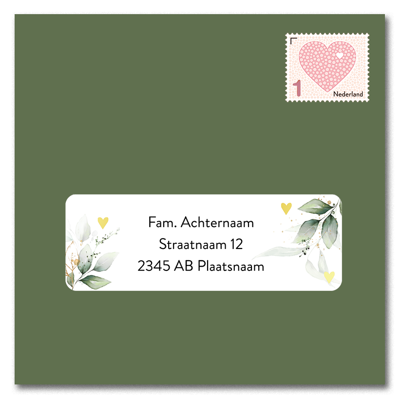 Hoe mooi passen deze adresstickers bij deze trouwkaart? Je kunt het ontwerp moeiteloos aanpassen met de editor en zelf heel eenvoudig alle adressen op de adresstickers plaatsen.