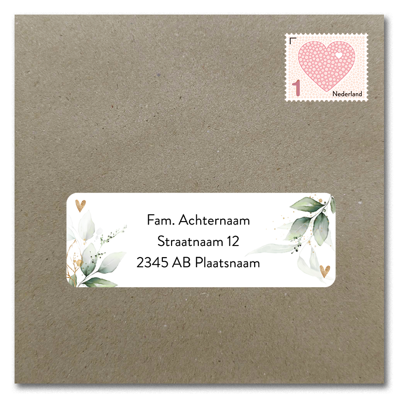 Hoe mooi passen deze adresstickers bij deze trouwkaart? Je kunt het ontwerp moeiteloos aanpassen met de editor en zelf heel eenvoudig alle adressen op de adresstickers plaatsen.