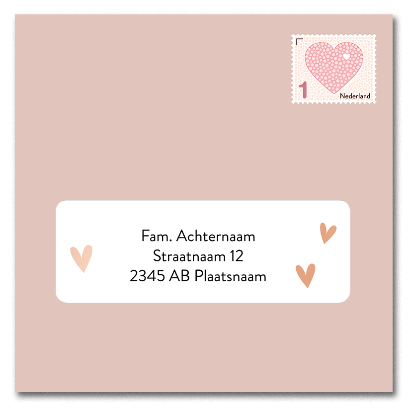 Deze adresstickers met rosegoudfolie hartjes past bij diverse ontwerpen. Je kunt de stickers met de editor aanpassen en de adresstickers weop plaatsen.