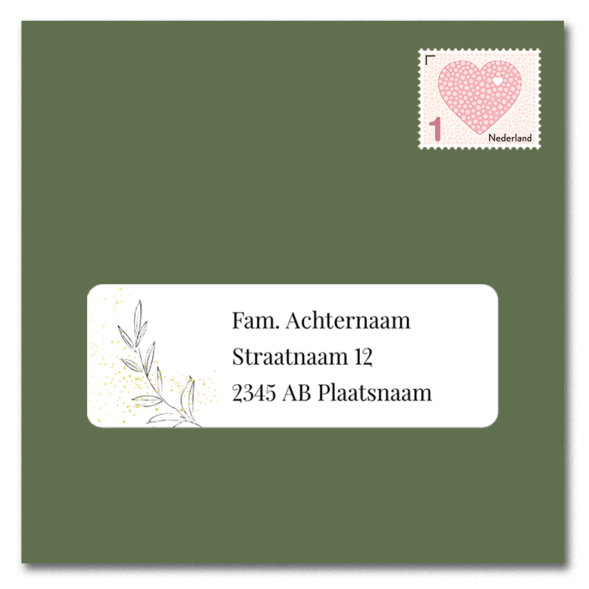 Hoe mooi passen deze adresstickers bij deze trouwkaart? Je kunt het ontwerp moeiteloos aanpassen met de editor en zelf heel eenvoudig alle adressen op de adresstickers plaatsen.