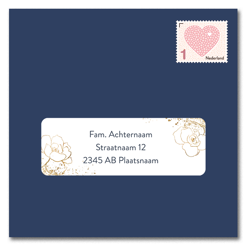 Hoe mooi passen deze adresstickers bij deze trouwkaart? Je kunt het ontwerp moeiteloos aanpassen met de editor en zelf heel eenvoudig alle adressen op de adresstickers plaatsen.