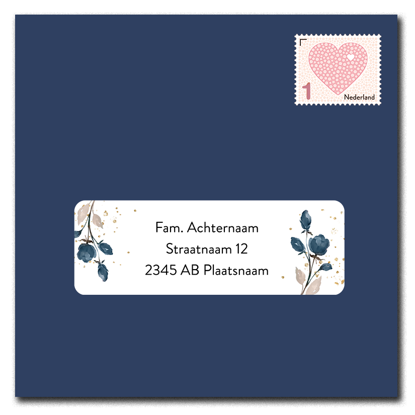 Hoe mooi passen deze adresstickers bij deze trouwkaart? Je kunt het ontwerp moeiteloos aanpassen met de editor en zelf heel eenvoudig alle adressen op de adresstickers plaatsen.