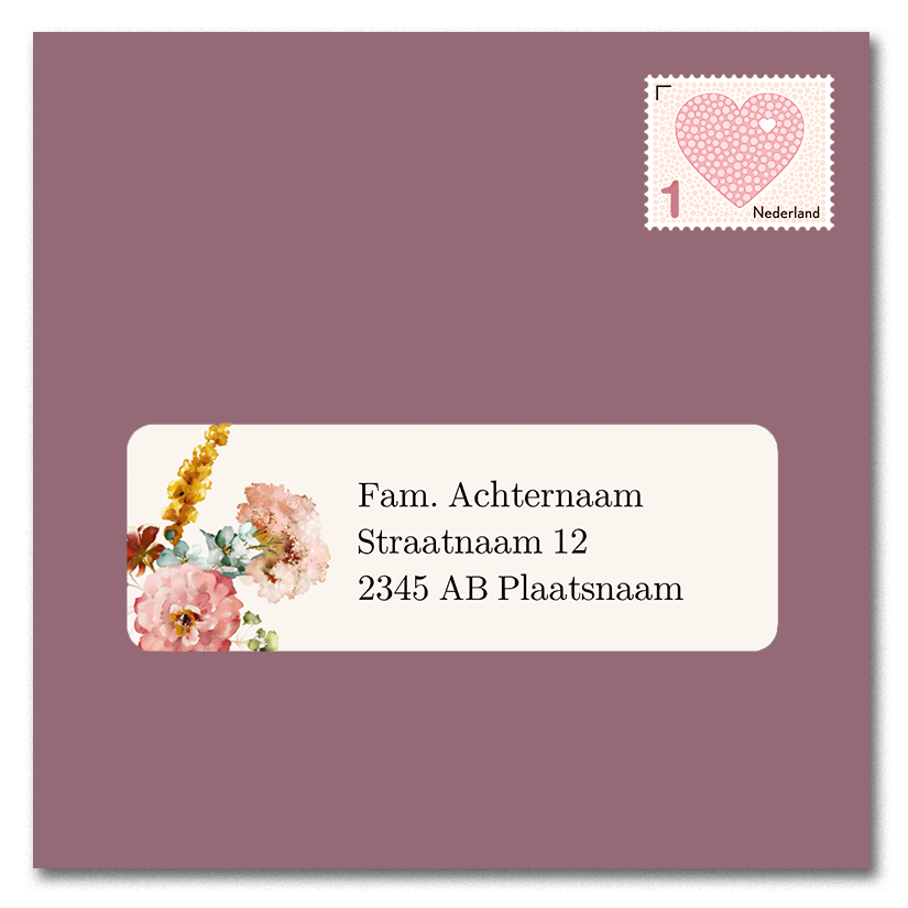 Hoe mooi passen deze adresstickers bij deze trouwkaart? Je kunt het ontwerp moeiteloos aanpassen met de editor en zelf heel eenvoudig alle adressen op de adresstickers plaatsen.