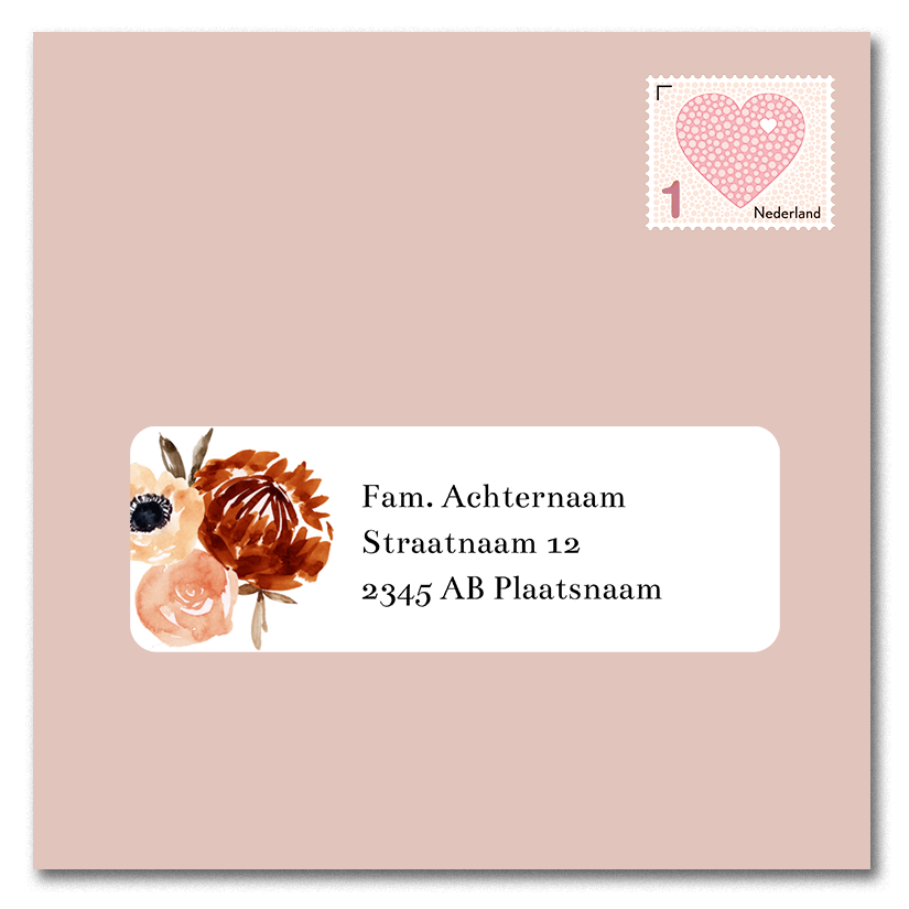 Hoe mooi passen deze adresstickers bij deze trouwkaart? Je kunt het ontwerp moeiteloos aanpassen met de editor en zelf heel eenvoudig alle adressen op de adresstickers plaatsen.
