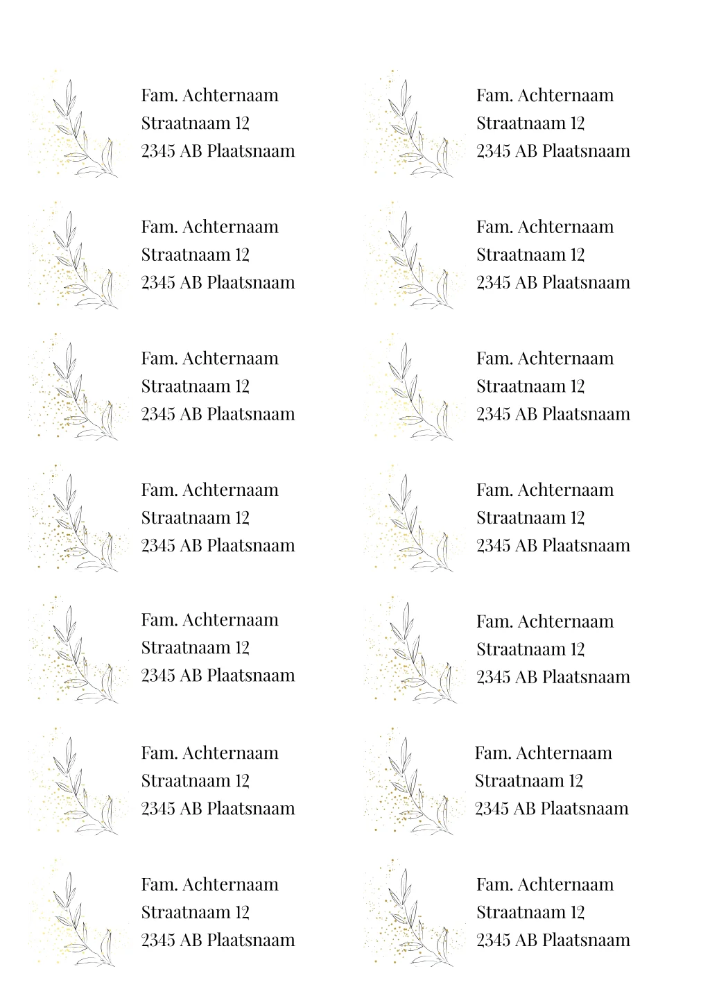 Adresstickers met spetters in goudfolie en bladeren