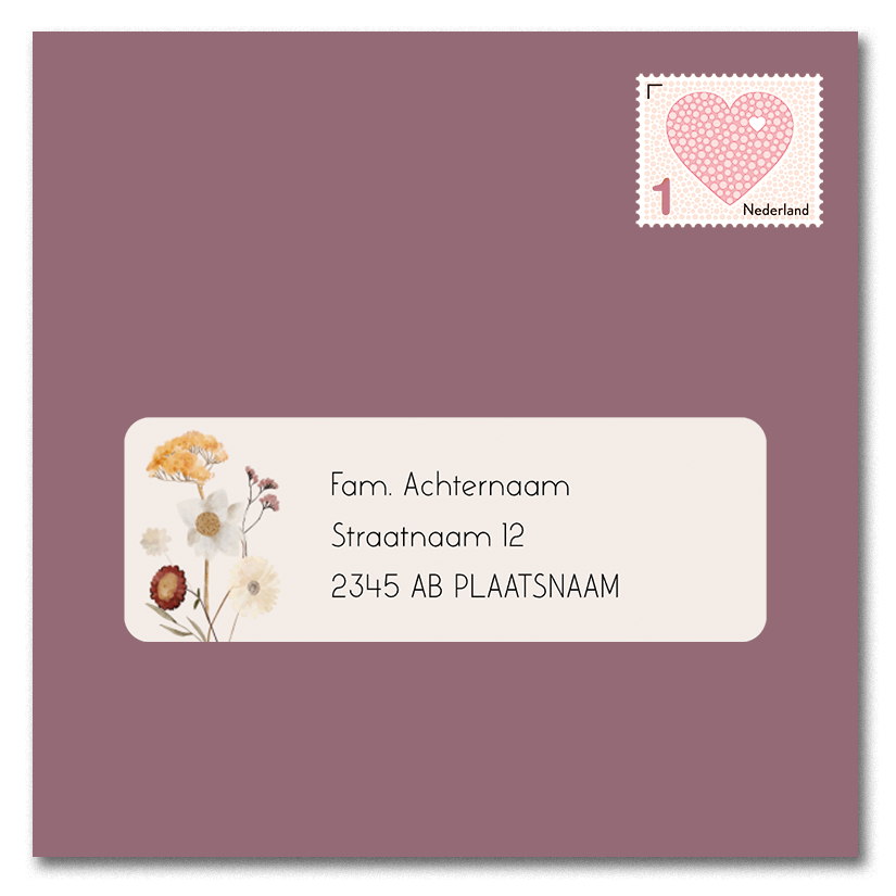 Hoe mooi passen deze adresstickers bij deze trouwkaart? Je kunt het ontwerp moeiteloos aanpassen met de editor en zelf heel eenvoudig alle adressen op de adresstickers plaatsen.