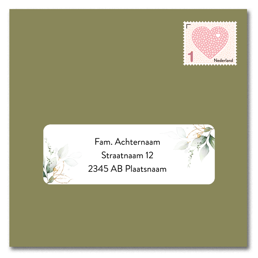 Hoe mooi passen deze adresstickers bij deze trouwkaart? Je kunt het ontwerp moeiteloos aanpassen met de editor en zelf heel eenvoudig alle adressen op de adresstickers plaatsen.
