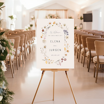 Stijlvolle bruiloftsbord met een krans van kleine bloemetjes. Pas de tekst eenvoudig aan.