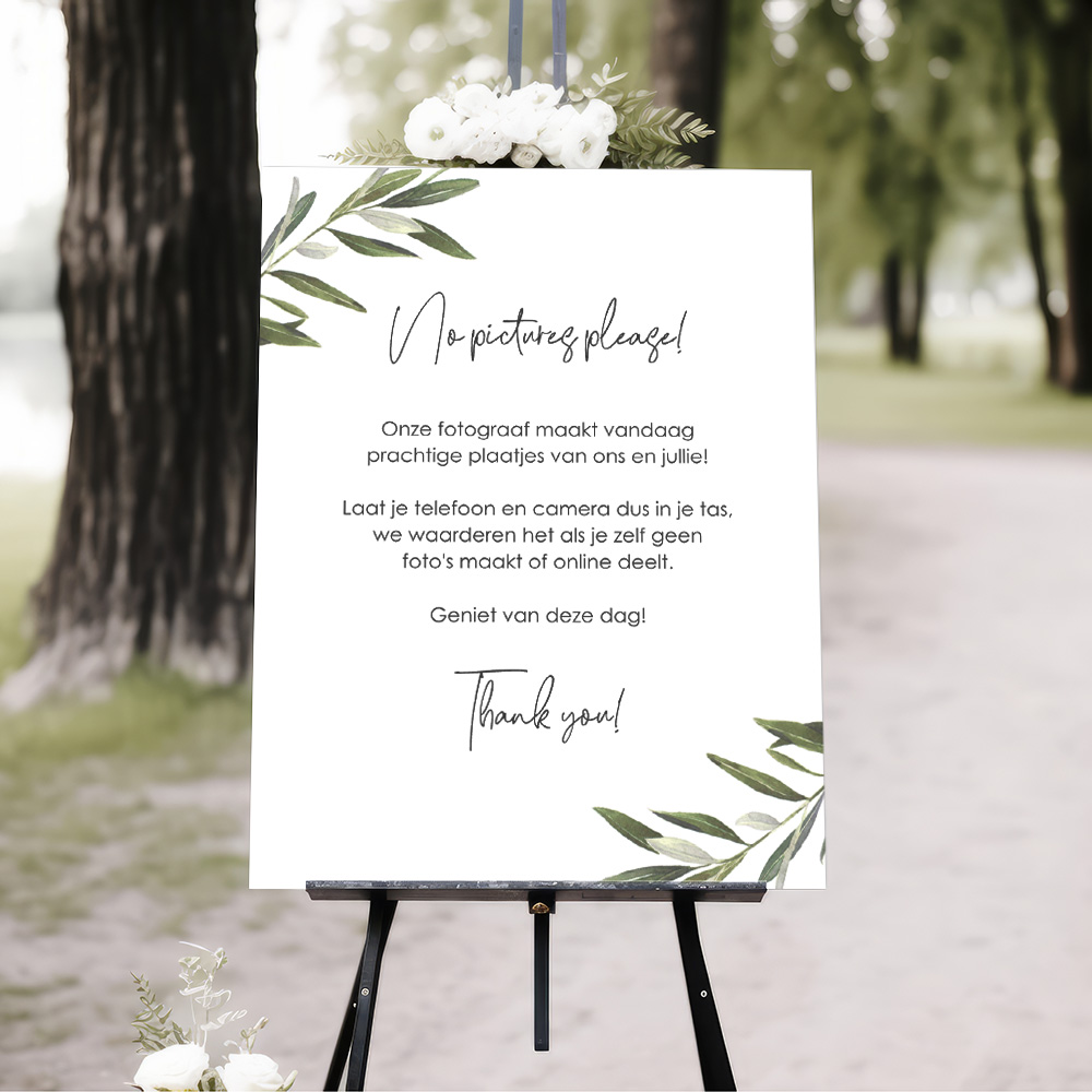 Willen jullie aan jullie gasten laten weten dat je liever niet hebt dat ze foto's maken tijdens jullie ceremonie? Zet dit mooie bord neer om iedereen te informeren over jullie 'unplugged' bruiloft. Pas de tekst zelf aan in onze handige editor. Dit bord heeft een formaat van 55x73 cm.