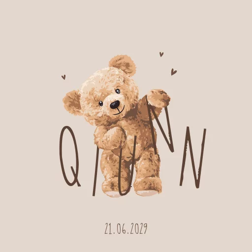 Canvasposter met latjes met een lieve bruine teddybeer die de naam van je kindje vasthoudt. De beweegbare arm en poot van de beer laten je toe om de letters precies goed te positioneren. Extra leuk als je ook voor het bijpassende geboortekaartje gaat. Pas deze canvasposter zelf aan in onze editor.