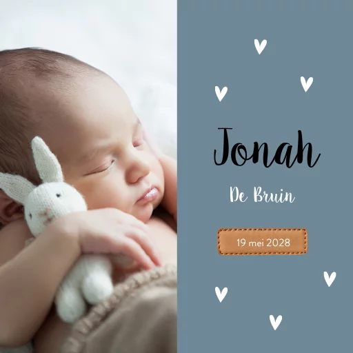 Blauwe canvasposter met leren label, eigen foto en hartjes