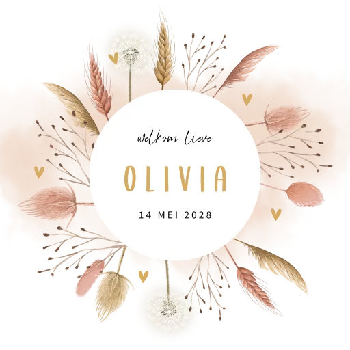Botanische canvasposter met houten magneetlatjes in formaat 40x40 cm om de babykamer van je pasgeboren dochter te versieren. Extra leuk als je ook voor het bijpassende geboortekaartje gaat. Pas deze canvasposter zelf aan in onze editor.