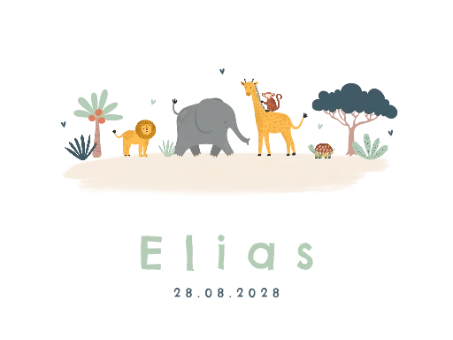 Canvas poster met kleine jungle en safari dieren op een rijtje. De naam van je kindje komt in mintgroene, speelse letters onder de diertjes. Pas deze canvas poster zelf aan in onze editor.