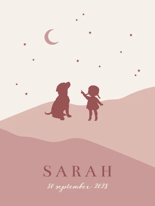 Op de canvas poster staat een klein silhouet meisje met daarnaast een trouwe viervoeter, mooi om op de babykamer te hangen. De poster zit geklemd tussen houten magneetlatjes en is formaat 30x40 cm. Extra leuk als je ook voor het bijpassende geboortekaartje gaat. Pas deze canvasposter zelf aan in onze editor.