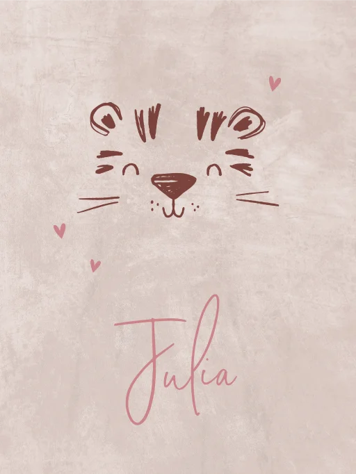 Canvas poster met houten latjes van 30x40 cm met getekend tijgertje, hartjes en speelse naam. Een mooie poster om op te hangen in de kamer van je pasgeboren kindje. Extra leuk als je ook voor het bijpassende geboortekaartje gaat. Pas deze canvas poster zelf aan in onze editor.