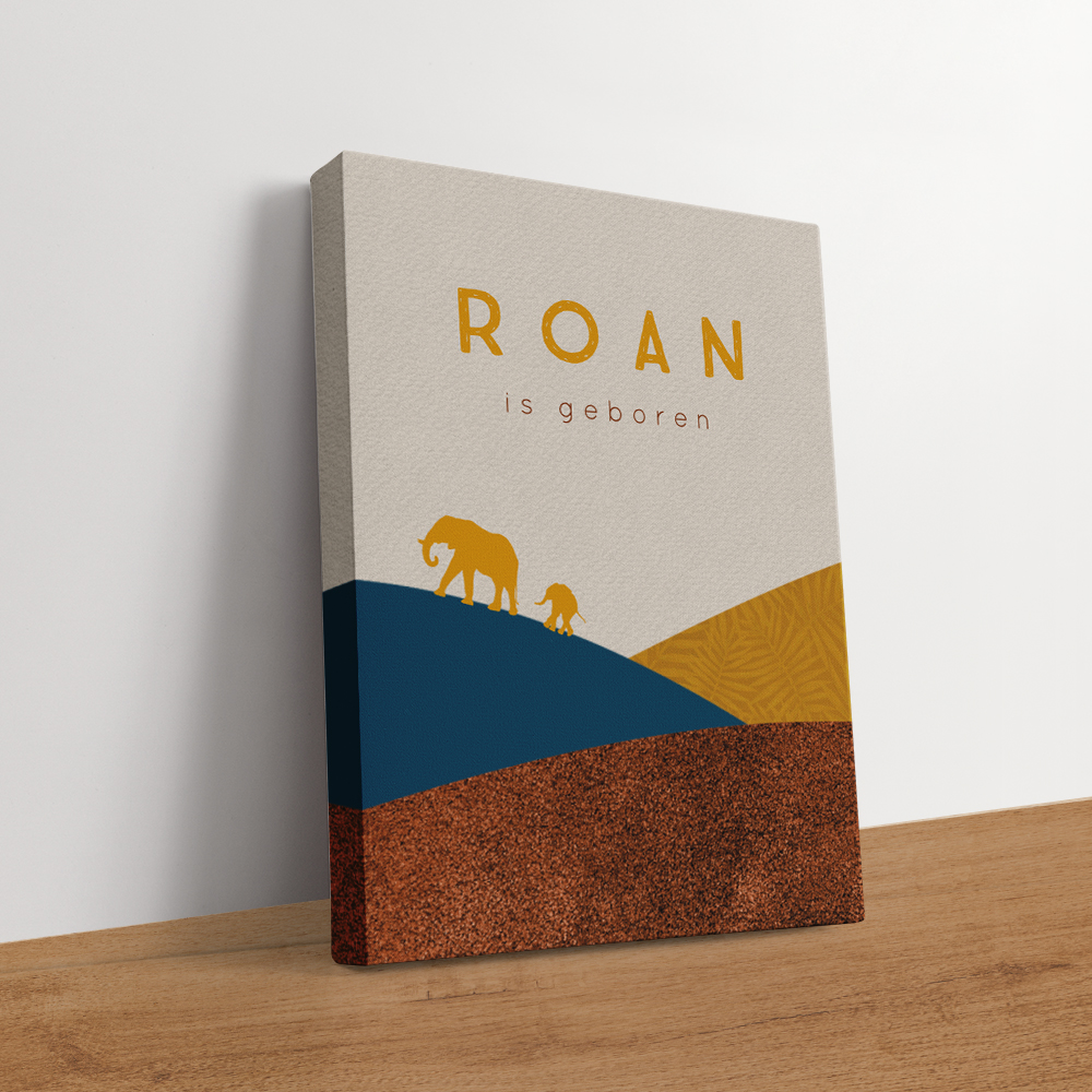 Leuk canvas schilderij van 30 x 40 cm met abstract landschap, gele olifantjes en stoere naam. Een mooi schilderijtje om op te hangen in de kamer van je zoontje. Extra leuk als je ook voor het bijpassende geboortekaartje gaat. Pas dit canvas schilderij zelf aan in onze editor.
