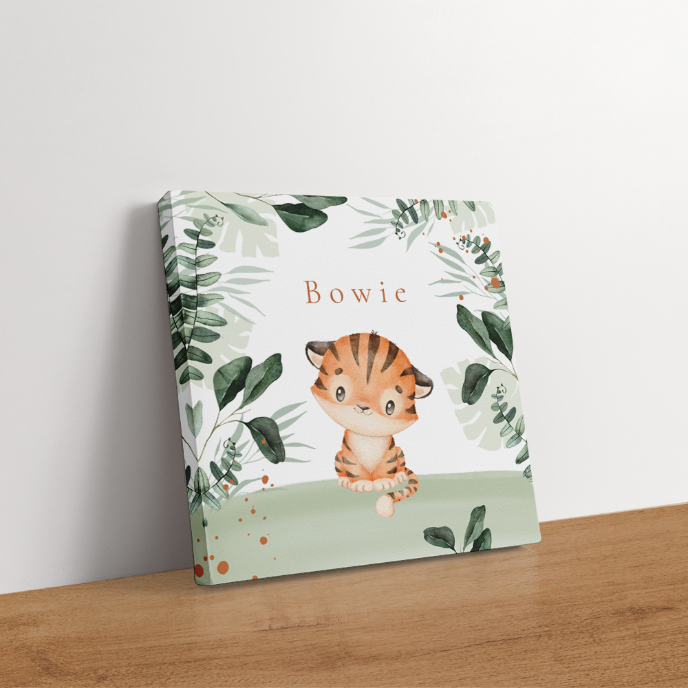 Een mooi canvas schilderij met lieve tijger van 40 x 40 cm om het kamertje van je pasgeboren kindje mee te versieren. Extra leuk als je ook voor het bijpassende geboortekaartje gaat. Pas dit canvas schilderij zelf aan in onze editor.