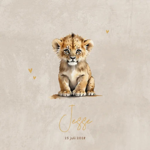Beige geboortetegel met waterverf illustratie van een baby leeuw en de naam in okergeel.