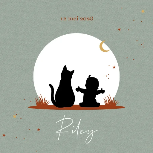 Grijsgroen geboortetegel met silhouet baby en kat die samen naar de zonsondergang kijken.