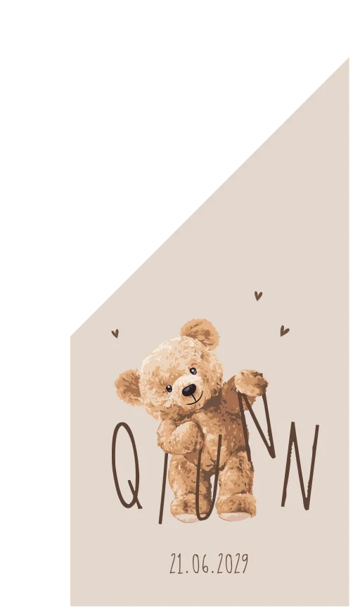 Geboortevlag met een lieve bruine teddybeer die de naam van je kindje vasthoudt. De arm en poot van de beer staan los om de letters goed te kunnen plaatsen.