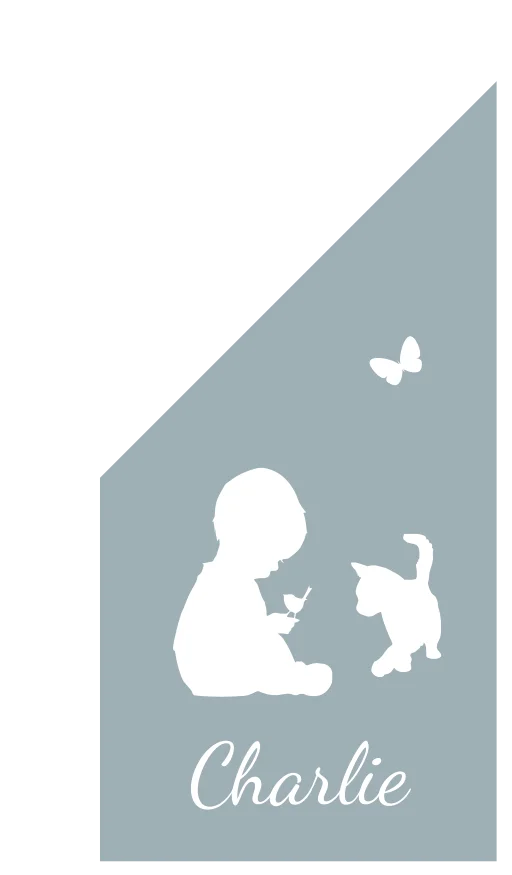 Blauwe geboortevlag met silhouet jongetje met een vogeltje in zijn handen, een nieuwsgierige kat en een vlindertje.