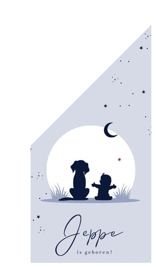 Wordt jullie zoon binnenkort geboren? Van harte gefeliciteerd! Stel de hele straat op de hoogte van dit bijzondere moment met onze gepersonaliseerde geboortevlag. Op deze zachtblauwe geboortevlag staan twee silhouetjes, een baby jongen en een lief hondje die samen naar de maan kijken.