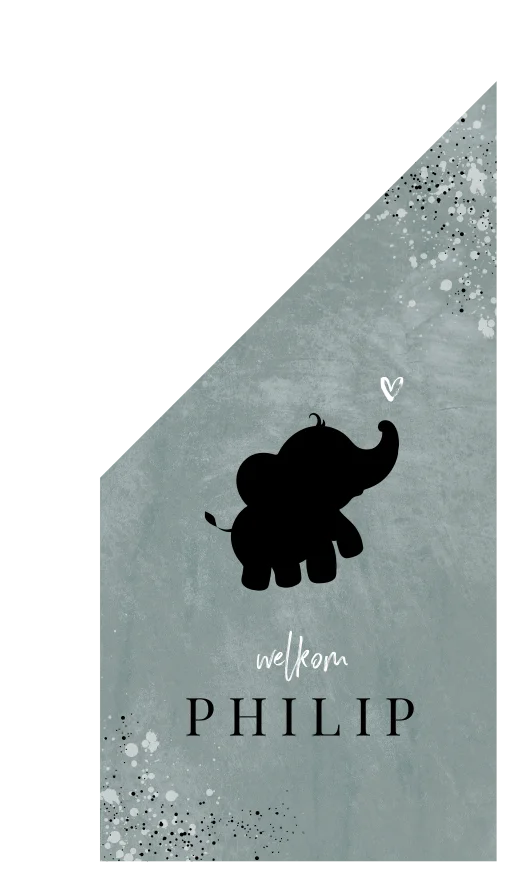 Je kunt de komst van je pasgeboren zoontje aankondigen met deze stoere geboortevlag, versierd met spetters en een schattig zwart olifantje.