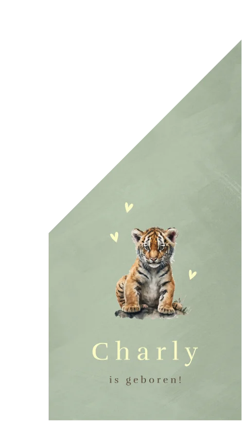 Een schattige geboortevlag met lief tijgertje op zachtgroene ondergrond om de komst van je kindje aan te kondigen bij jouw in de buurt.