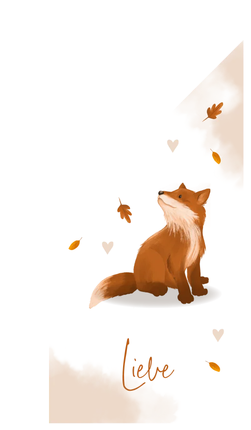 Lieve geboortevlag met zittend vosje, roze waterverf en herfstblaadjes.
