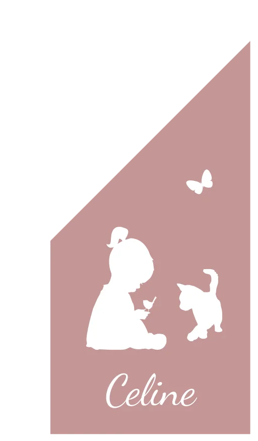 Roze geboortevlag met silhouet meisje met een vogeltje in haar handen, een nieuwsgierige kat en een vlindertje.