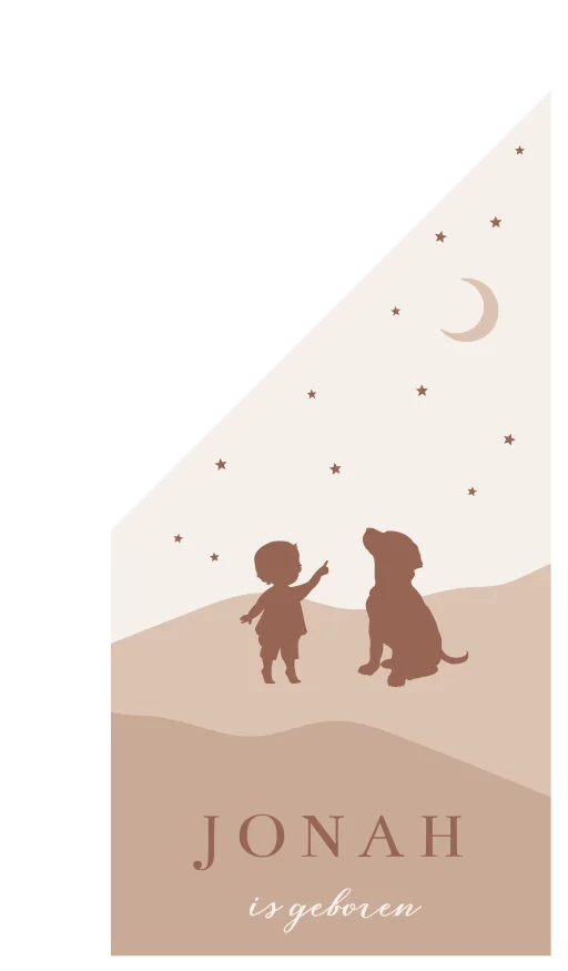 Geboortevlag om aan de gevel van je huis te hangen met in silhouet een jongen met daarnaast zijn trouwe viervoeter.