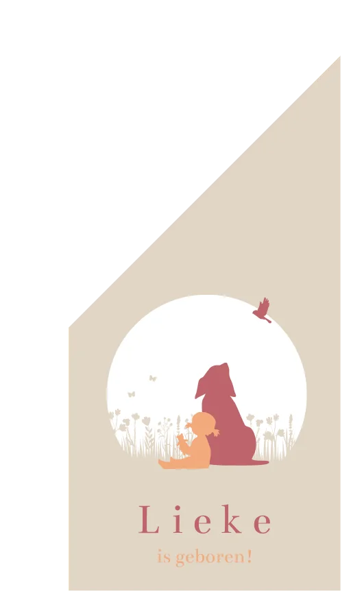 Een klein meisje zit met een teddybeertje en een grote hond in een bloemenveld. Wat een leuke vlag om aan de gevel van je huis te hangen als je dochter geboren is.