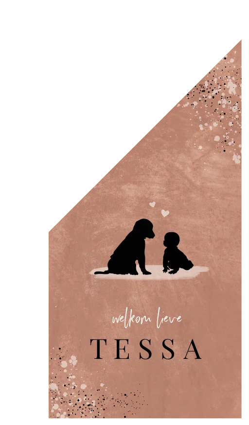 Heb je een trouwe viervoeter en verwacht je een dochtertje? Kondig de komst van de kleine aan met deze terracotta geboortevlag met silhouetjes van een hond en een baby. De kaart wordt verder versierd met spetters en waterverf vlekken.