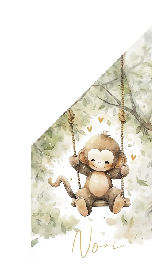 Geboortevlag met een lief aapje in de jungle zittend op een schommel.