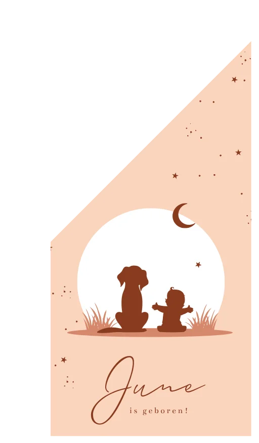 Wordt jullie dochter binnenkort geboren? Van harte gefeliciteerd! Laat de hele buurt meegenieten van dit bijzondere moment met onze gepersonaliseerde geboortevlag met twee silhouetjes, een baby meisje en een lief hondje die samen naar de zonsondergang kijken. De maan en sterren staan al aan de hemel.