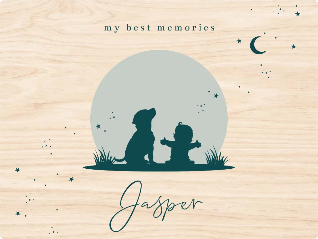 Memorybox met een silhouet illustratie van een baby en een hondje die samen naar de zonsondergang kijken. De kleur is groen maar kun je aanpassen naar een eigen kleur. Hetzelfde voor het hondje, in de editor kun je bij silhouetjes kiezen voor heel veel verschillende hondjes.