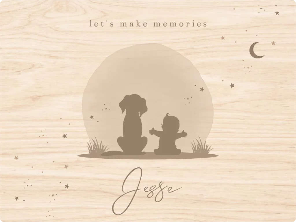 Memorybox met in bruin een silhouet van een baby jongetje en een hondje die samen naar de zonsondergang kijken. Je kunt de kleuren eenvoudig zelf wijzigen in de designtool. hetzelfde voor het hondje, heb je zelf een ander ras? Kijk in de designtool voor de mogelijkheden.