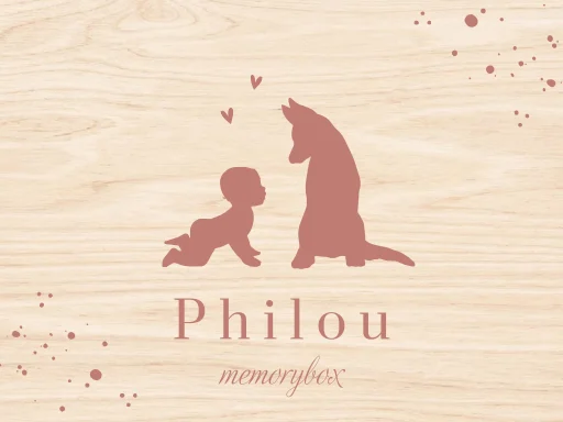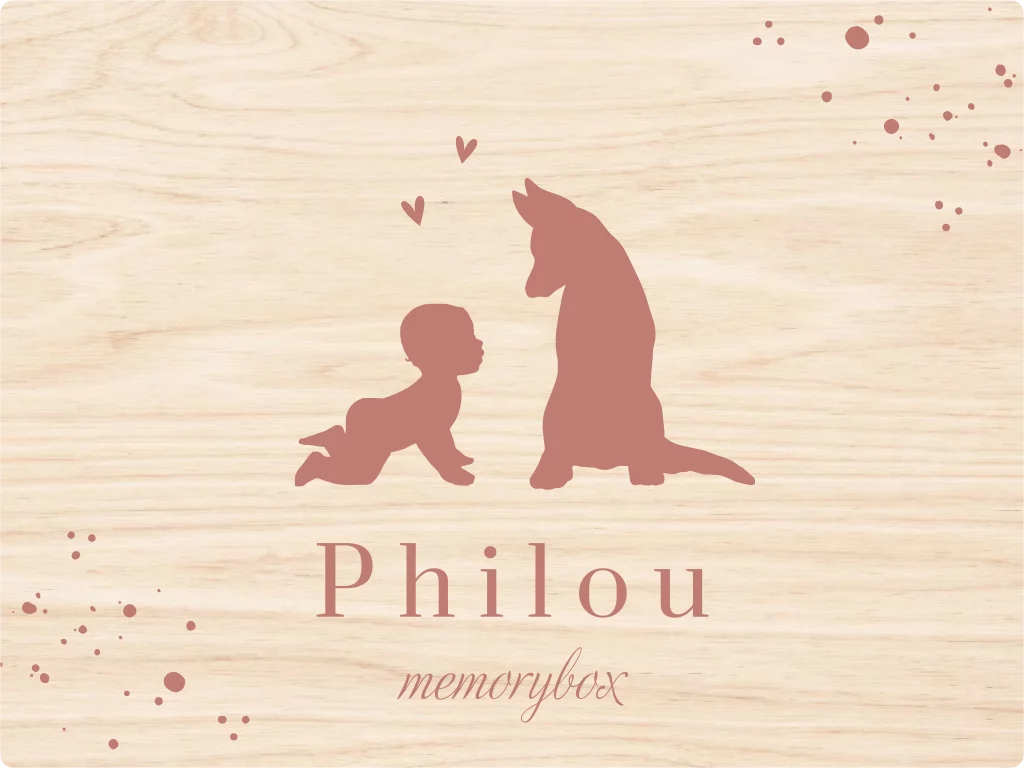 Memorybox met silhouetjes van een baby meisje en hond in roze. De spetters en hartjes versieren de rest van de box. Je kunt het ontwerp eenvoudig aanpassen in de editor, kies bijvoorbeeld een andere hond, pas de keur aan en uiteraard de naam.