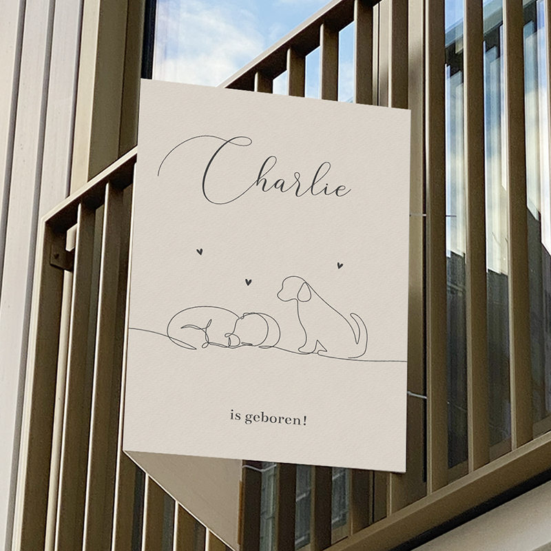 Dit staande, beige geboortebord van 40x60 cm met een lijntekening van baby met hondje past perfect bij dit geboortekaartje. Bevestig dit geboortebord met zuignappen op het raam en de hele buurt weet gelijk dat er bij jullie een kindje geboren is.