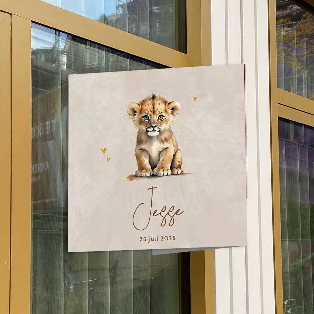 Dit vierkante beige geboortebord van 50x50 cm met waterverf illustratie van een baby leeuw past perfect bij dit geboortekaartje. Bevestig dit geboortebord op het raam en de hele buurt weet gelijk dat er bij jullie een kindje geboren is.